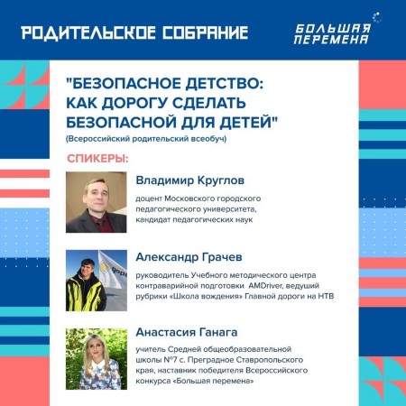 Мы вместе с партнерами недели – ГУОБДД МВД России – проведем Всероссийский родительский всеобуч на тему «Безопасное детство: как дорогу сделать безопасной для детей». В нем примут участие: