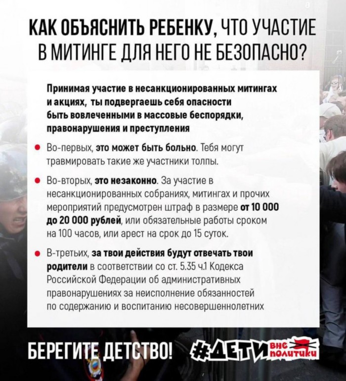 Любой митинг, даже если он начинается мирно, может перерасти в стихийную неуправляемую толпу. Подростки, вовлеченные в несанкционированные митинги и акции, подвергаются опасности быть втянутыми и в массовые беспорядки, правонарушения и преступления. Участие подростков в несанкционированных митингах и акциях опасно для их жизни и здоровья, поскольку во время массовых беспорядков они могут быть травмированы и могут получить вред здоровью различной степени тяжести.