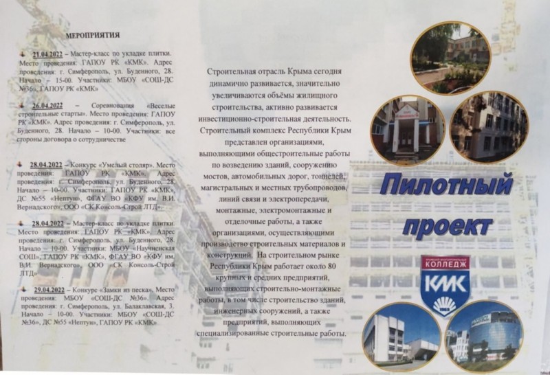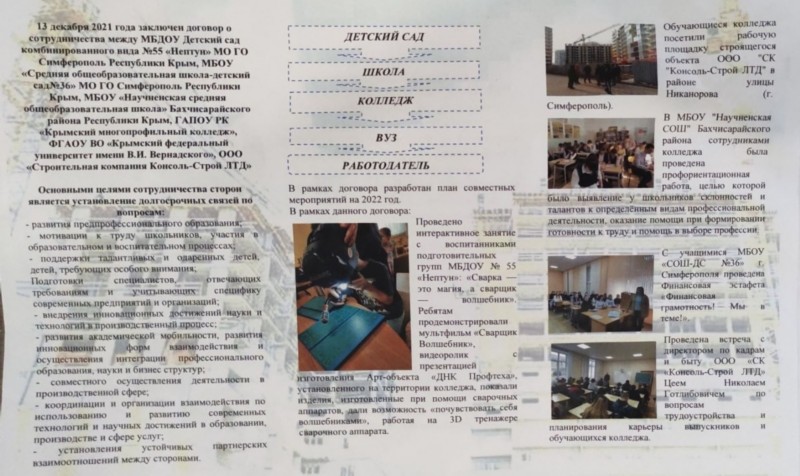 22 ноября 2022 года в рамках многостороннего договора о сотрудничестве между ООО «Строительной компанией «Консоль-Строй ЛТД», ФГАОУ ВО «КФУ им. В.И. Вернадского», ГАПОУ РК «Крымский многопрофильный колледж», МБОУ «СОШ-детский сад» №36, МБОУ «Научненская СОШ» и МБДОУ Детский сад комбинированного вида №55 «Нептун», на основании совместной плана работы сторон договора, состоялось мероприятие для обучающихся 9-А класса МБОУ «СОШ-детский сад» №36 г. Симферополя.