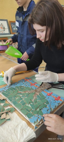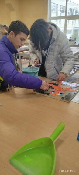 В рамках плотного проекта по взаимодействию предприятий реального сектора экономики с образовательными учреждениями 21 апреля 2022 года учащиеся 9-Б класса МБОУ "СОШ- детский сад" №36 посетили ГАПОУ РК "Крымский многопрофильный колледж". Учащиеся учились строительным навыкам: девочки собирали плиточную мозаику, а мальчики учились выкладывать плитку.