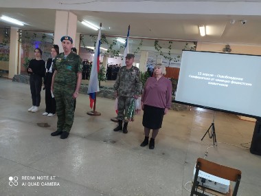13 àïðåëÿ 2022 ãîäà èñïîëíÿåòñÿ 78 ëåò ñî äíÿ îñâîáîæäåíèÿ ãîðîäà Ñèìôåðîïîëÿ îò íåìåöêî-ôàøèñòñêèõ çàõâàò÷èêîâ.  ýòîò äåíü â øêîëå ïðîøëà òîðæåñòâåííàÿ ëèíåéêà è êëàññíûå ÷àñû, ïîñâÿùåííûå ýòîìó çíàìåíàòåëüíîìó äëÿ êàæäîãî ñèìôåðîïîëüöà ñîáûòèþ. Ìåðîïðèÿòèÿ â øêîëå ïðîõîäèëè ñ ó÷àñòèåì ñîòðóäíèêà Íàðîäíîãî îïîë÷åíèÿ Êðûìà Ðåíãà÷ À.Þ., êîòîðûé â ñâîèõ âûñòóïëåíèÿõ ïîä÷åðêíóë çíà÷èìîñòü ýòîãî èñòîðè÷åñêîãî ñîáûòèÿ.