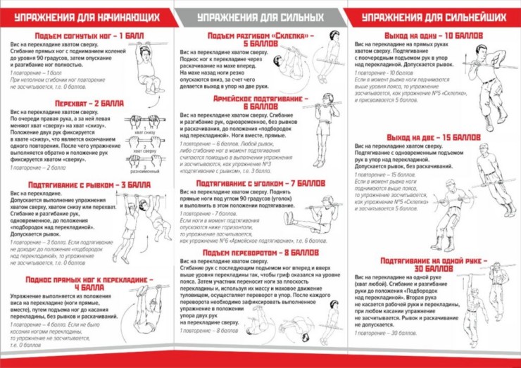 Ñïîðòñìåí â òå÷åíèå 1 ìèíóòû âûïîëíÿåò ëþáûå èç 11 óïðàæíåíèé â ïðîèçâîëüíîì ïîðÿäêå. Ïðè ýòîì îí ìîæåò îòäûõàòü â âèñå íà òóðíèêå èëè ñïðûãíóâ íà çåìëþ. Âðåìÿ âûïîëíåíèÿ íå îñòàíàâëèâàåòñÿ. Çàäà÷à ñïîðòñìåíà – ñäåëàòü ìàêñèìàëüíîå êîëè÷åñòâî ïîâòîðåíèé êàæäîãî âûáðàííîãî óïðàæíåíèÿ. Êàæäîìó óïðàæíåíèþ ñîîòâåòñòâóåò îïðåäåëåííîå êîëè÷åñòâî áàëëîâ. ×åì ñëîæíåå óïðàæíåíèå, òåì áîëüøå çà íåãî áàëëîâ. Èòîãîâàÿ ñóììà áàëëîâ ïîçâîëÿåò îïðåäåëèòü óðîâåíü òåêóùåé ïîäãîòîâëåííîñòè ñïîðòñìåíà ëèáî òî÷íî îïðåäåëèòü ïîáåäèòåëÿ ñîðåâíîâàíèÿ.