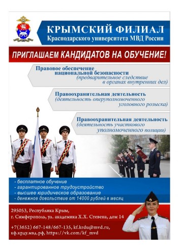 Крымский филиал Краснодарского университета МВД России осуществляет подготовку квалифицированных специалистов для службы в органах внутренних дел Российской Федерации.
