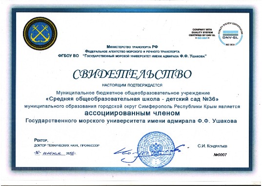 30.06.2016г. МБОУ «СОШ-детский сад» №36 заключила договор о сотрудничестве с ФГБОУ ВО «Государственный морской университет имени адмирала Ф.Ф. Ушакова»