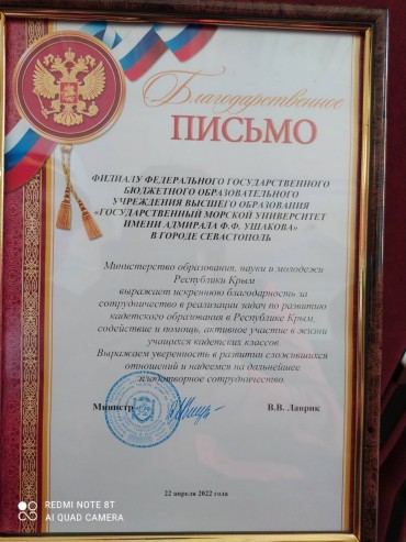 22 апреля 2022 года Министр образования Республики Крым Лаврик В.В. вручила грамоты учреждениям, которые осуществляют шефскую помощь кадетским классам. Филиал ГБОУ "Государственный морской университет имени адмирала Ф.Ф.Ушакова" был награждён благодарственным письмом Министерства образования, науки и молодежи Республики Крым.